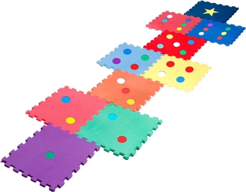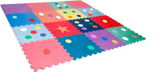 Ryškios spalvos ir formos (taškeliai, žvaigždė) skatina jutiminį suvokimą ir smulkiosios bei stambiosios motorikos raidą. Putos slopina smūgius ir saugo nuo grindų šalčio.