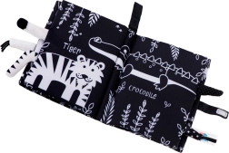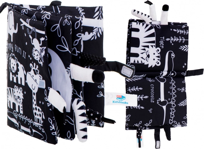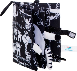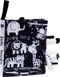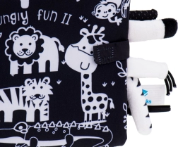 Ši minkšta jutiminė knygelė – idealus palydovas kūdikiams nuo 0+. Kontrastinės juodai baltos safari gyvūnų (žirafa, liūtas, dramblys, beždžionėlė, tigras, krokodilas) iliustracijos patraukia dėmesį ir padeda teisingai vystytis regai pirmaisiais mėnesiais. Išlendančios minkštos uodegytės kviečia liesti ir treniruoja sugriebimą.