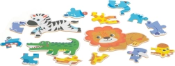 Ši kūrybiška dėlionė su gyvūnais, tokiais kaip žirafa, liūtas, zebras ir krokodilas, skatina vaikų vaizduotę ir padeda susikaupti. Dėka spalvingų iliustracijų ir didesnių dalių vaikai mokosi logiškai mąstyti, lavina smulkiąją motoriką ir kantrybę.