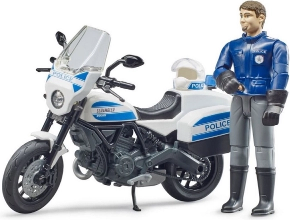 Policinis motociklas DUCATI Scrambler iš Bruder – kruopščiai sukurtas modelis mažiems ir dideliems gelbėjimo tarnybų gerbėjams. Motociklas turi pasukamą vairą lengvam manevravimui ir nulenkiamą kojelę stabiliam pastatymui. Policininko figūrėlė turi judančias galūnes, todėl ją galima pasodinti į važiavimo poziciją arba pastatyti šalia.