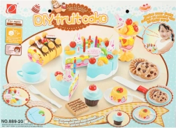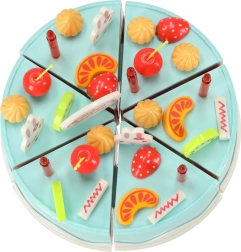Praskaidrinkite vaikų šventę su šiuo mėlynu pjaustomu gimtadienio tortu – 75 dalių rinkinys, pilnas vaisių, žvakučių ir priedų žaidimams „konditerijoje“. Dėl lipnių juostelių (Velcro) jungčių vaikai lengvai perpjaus ir vėl sudės tortą, puoš pagal fantaziją ir lavins smulkiąją motoriką bei socialinius įgūdžius. Pagaminta iš saugaus ABS plastiko, tinkama nuo 3 metų.