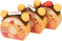 Šešios torto dalys sujungtos lipniomis juostelėmis – vaikai jas lengvai perpjauna plastikiniu peiliu ir vėl sudeda. Idealu smulkiajai motorikai lavinti ir realistiškam žaidimui.