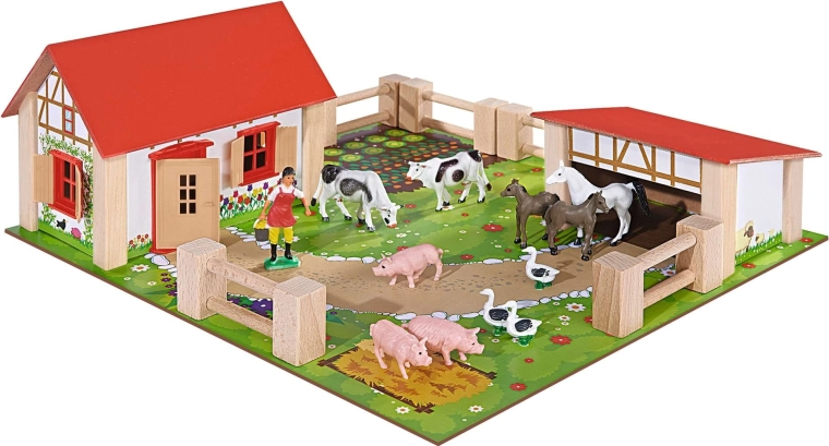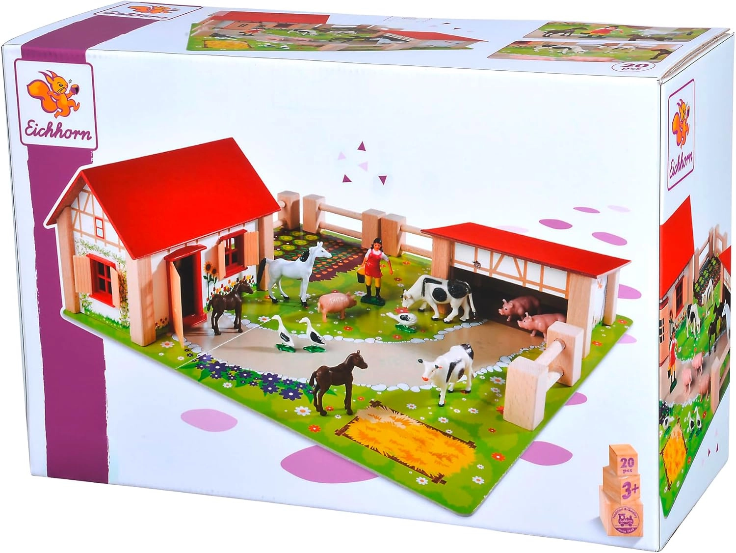 EICHHORN medinis ūkis pradžiugins kiekvieną mažąjį ūkininką. Rinkinyje yra namelis su raudonu stogu, tvartas, tvoros ir detalios gyvūnų figūrėlės, įskaitant arkliukus, karvutes, paršelius ir žąsis. Taip pat yra spalvingas pagrindas su takais ir darželiu, kuris lengvai nukreipia vaikus kurti savo scenas ir istorijas. Tvirta medinė konstrukcija ir patvarios medžiagos užtikrina ilgą tarnavimo laiką ir saugų žaidimą.
