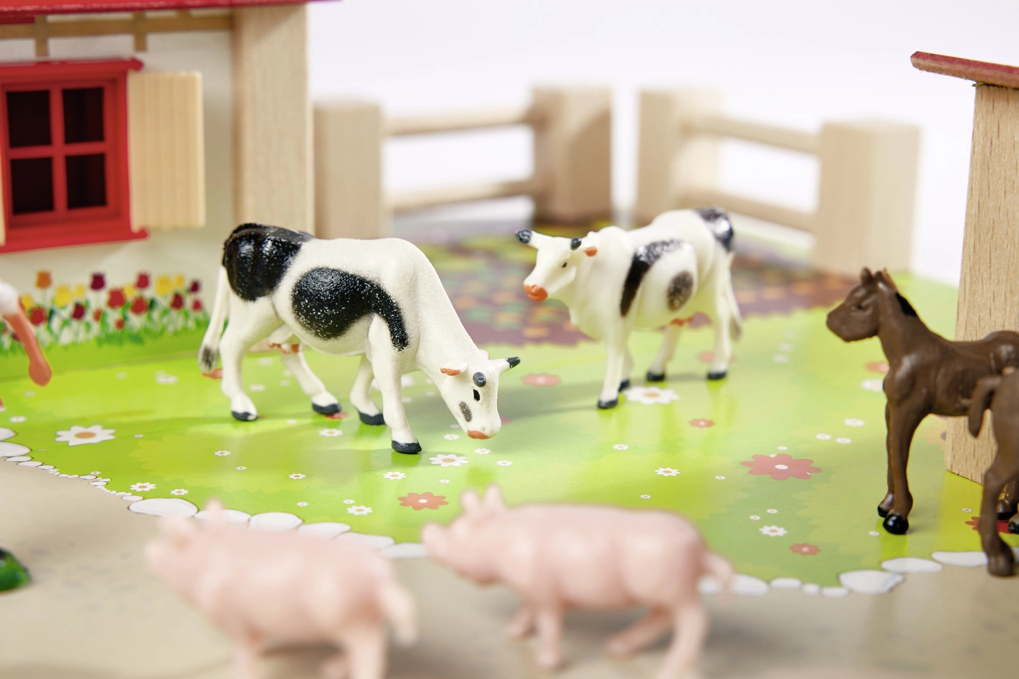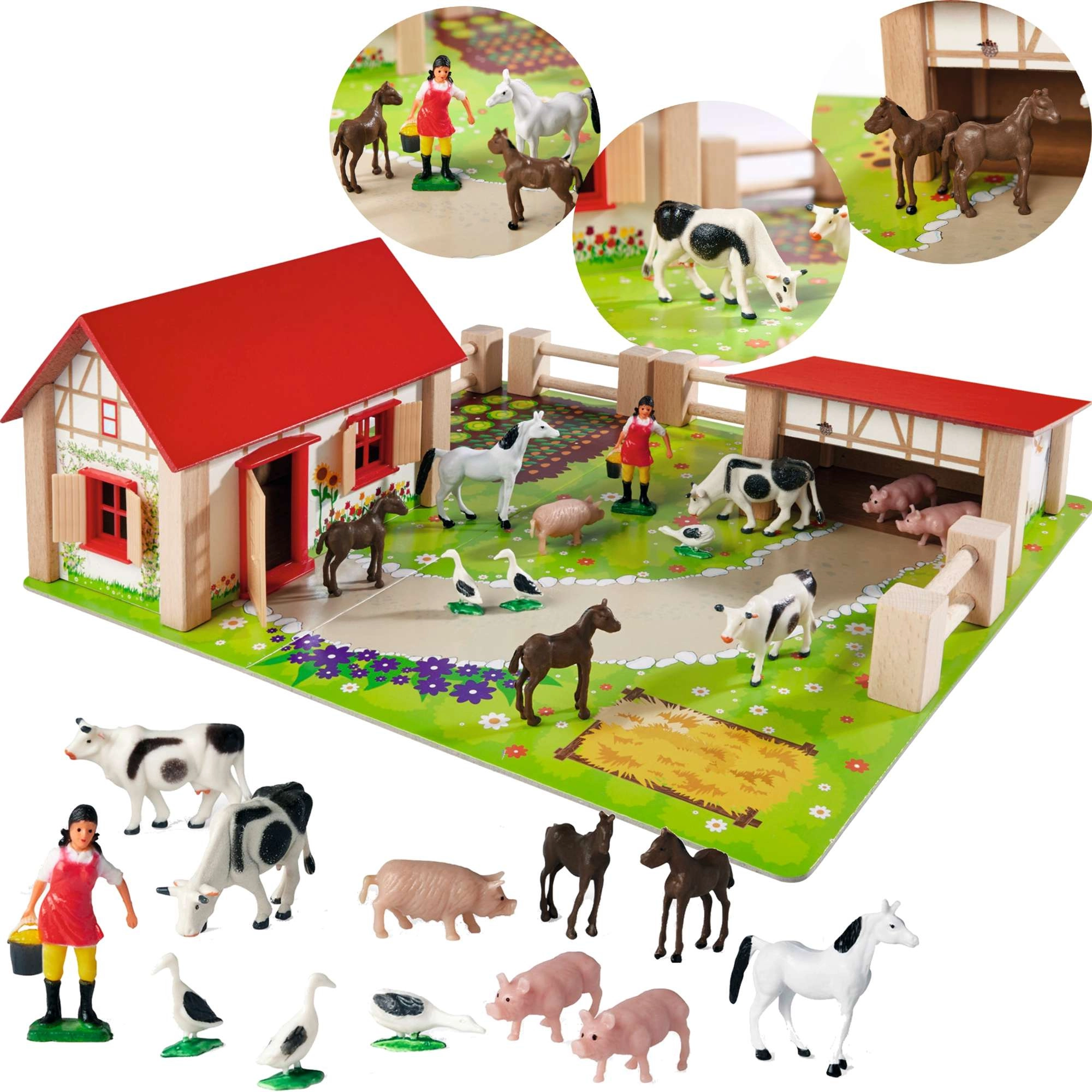 - namelis, tvartas, spalvingas pagrindas, aptvarai/tvoros, lipdukai, 12 figūrėlių (3 paršeliukai, 2 karvės, 3 žąsys, 3 arkliai, ūkininkė)