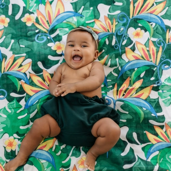 Lengvas ir purios tekstūros bambuko–medvilnės muslininis vystyklo audinys Tommy Lise su raštu Lush Garden švelnus kūdikio odai, kvėpuojantis, vėsinantis ir malonus liesti. Dėl didelio 120 × 120 cm dydžio tinka kaip užklotas, vystyklais suvynioti ar kaip apsauga žindymo metu.