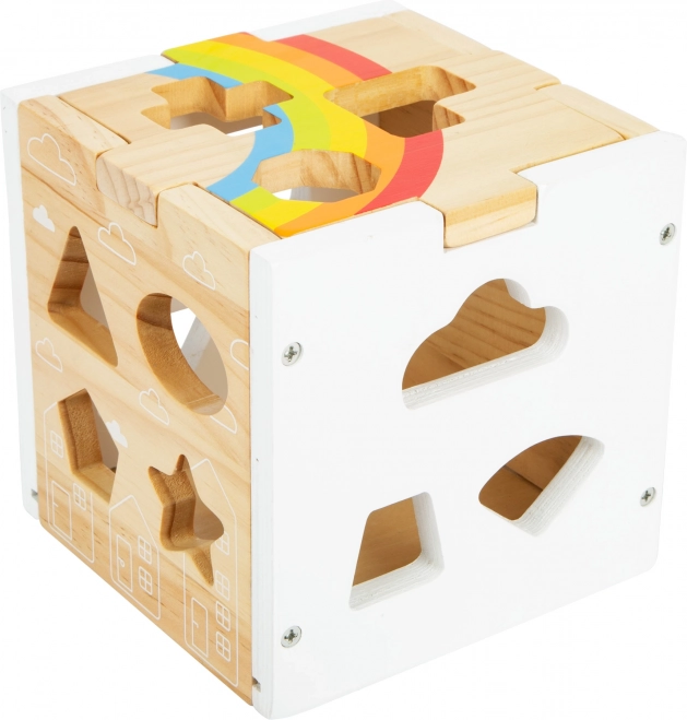 Ši moderni medinė SMALL FOOT dėžutė su įdedamomis formomis išsiskiria natūralios medienos švaria išvaizda, derinama su baltais skydeliais ir ryškiomis detalėmis. Vaikai į angas deda tokias formas kaip apskritimas, žvaigždė, trikampis, kryžius, debesėlis ar namelis – taip žaismingai lavina smulkiąją motoriką ir loginį mąstymą.