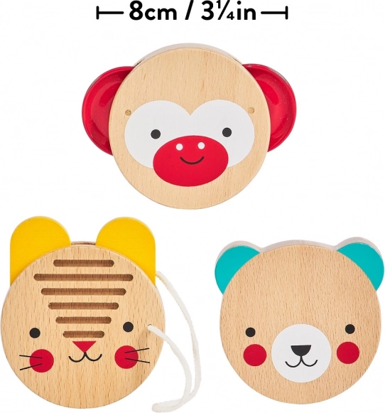 Trys paprasti mušamieji instrumentai su gyvūnėlių motyvais skatina natūralų ritmo pojūtį ir džiaugsmą muzikuojant nuo ankstyvo amžiaus.