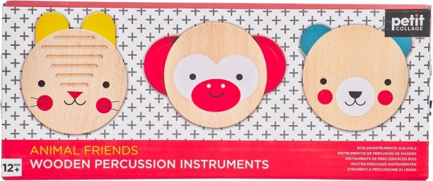 Šis žaismingas trijų mušamųjų instrumentų rinkinys iš Petit Collage – puiki įžanga į muzikos pasaulį. Linksmi gyvūnėlių motyvai (beždžionėlė, meškutis ir triušelis) skatina vaikus tyrinėti ritmą ir garsus, kurie padeda natūraliai lavėti klausai ir pojūčių suvokimui.