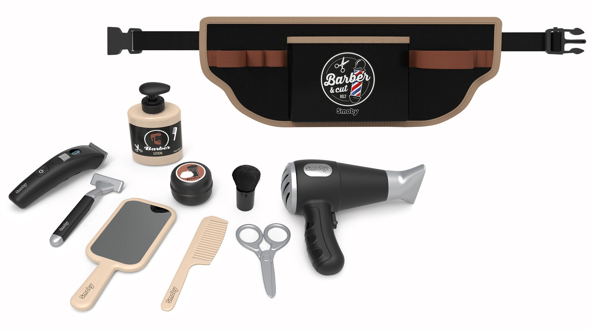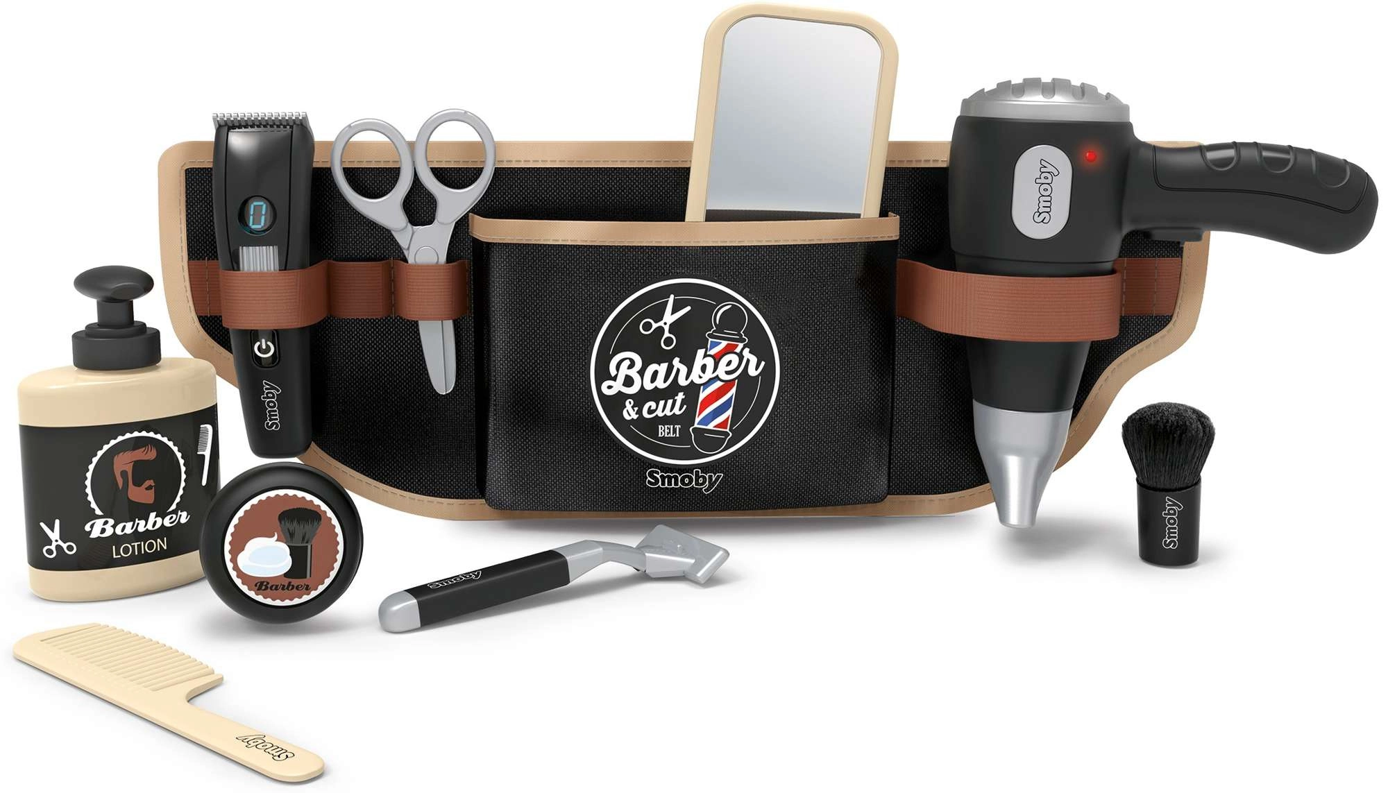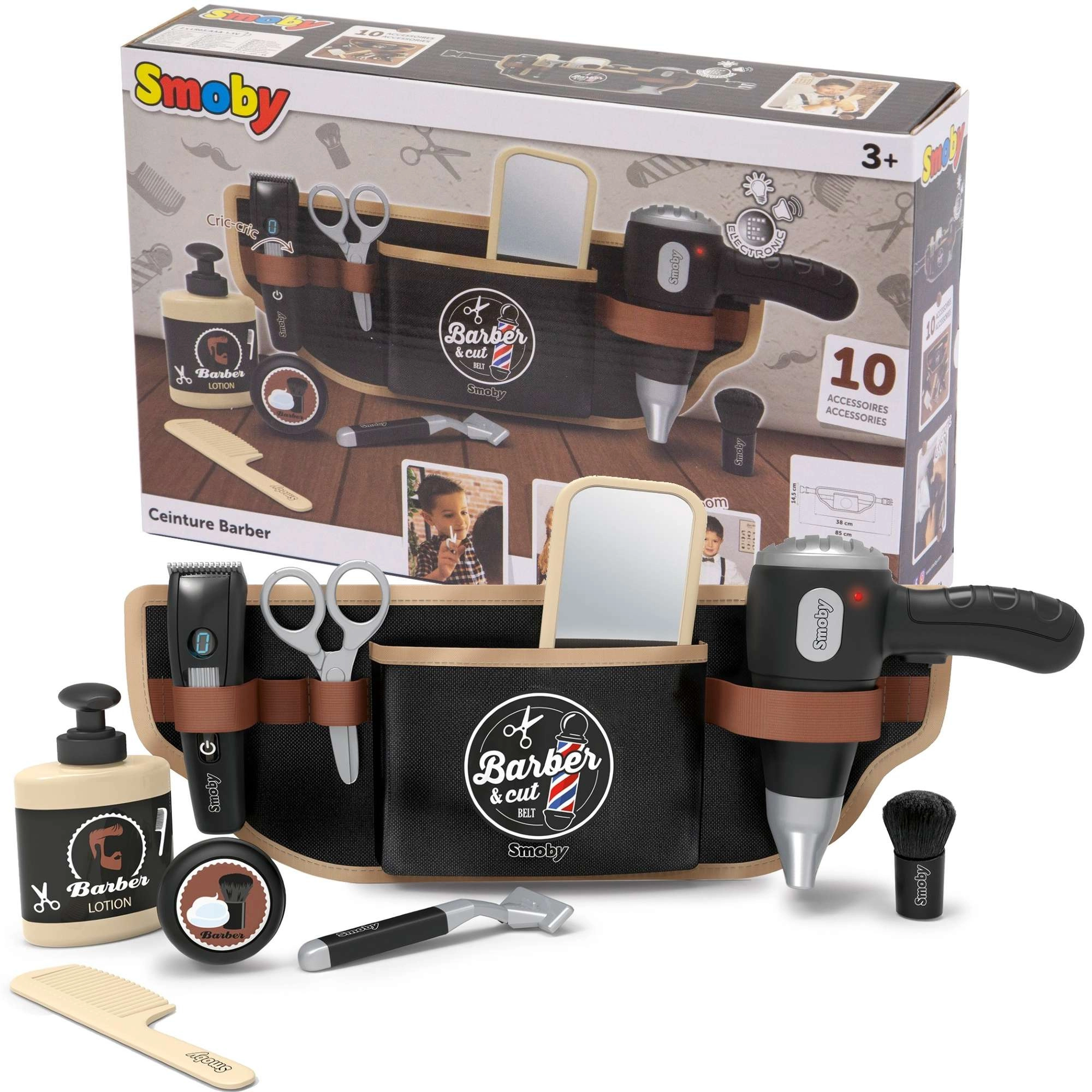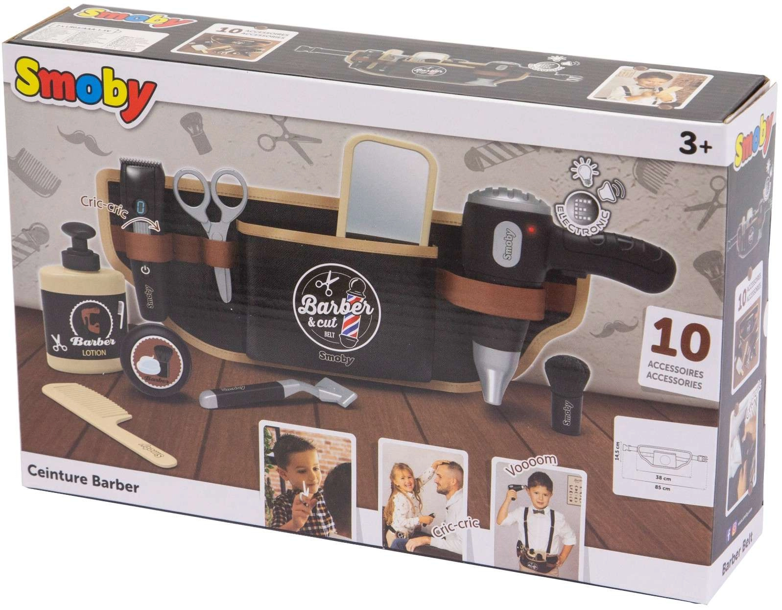 Vaikiškas kirpėjo diržas Smoby myBeauty pavers kiekvieną dieną smagiu salono nuotykiu. Dėl reguliuojamo diržo vaikai visus reikmenis laiko saugiai ir visada pasiekiamai – nuo feno ir žirklių iki šukos bei skutimosi aparato. Interaktyvus fenas skleidžia realistiškus garsus, todėl žaidimas atrodo tikras.