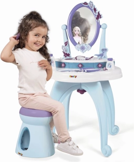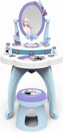 2-in-1 tualetinis staliukas, įkvėptas Ledo karalystės, siūlo viską, ko mažosioms princesėms reikia kasdienei priežiūrai. Jame yra didelis pasukamas veidrodis ir gausi komplektacija, tokia kaip kvepalai ir kiti kosmetiniai aksesuarai.