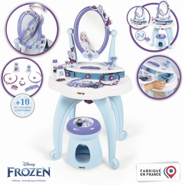 Pasinerkite į stebuklingą Ledo karalystės pasaulį su šiuo stilingu 2-in-1 tualetiniu staliuku. Nuostabus dizainas Elzos ir Anos spalvomis bet kurį kambarį pavers rūmų menėmis.