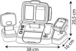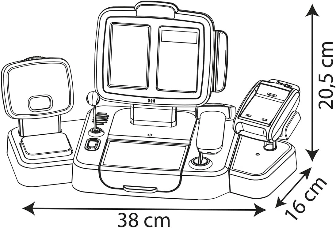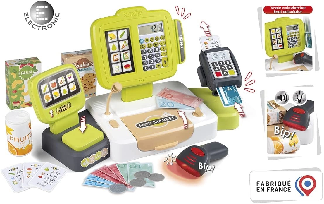 Skatinkite vaikų vaizduotę ir pirmuosius finansinius įgūdžius su elektroniniu kasos aparatu SMOBY. Mažieji pardavėjai pasvers prekes integruotomis svarstyklėmis, nuskaitys jas pyptelėjimu ir aiškiame LCD ekrane apskaičiuos kainą. Atsiskaityti galima grynaisiais arba kortele, o spausdintuvas išduos kvitą – lyg tikroje parduotuvėje.