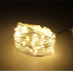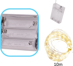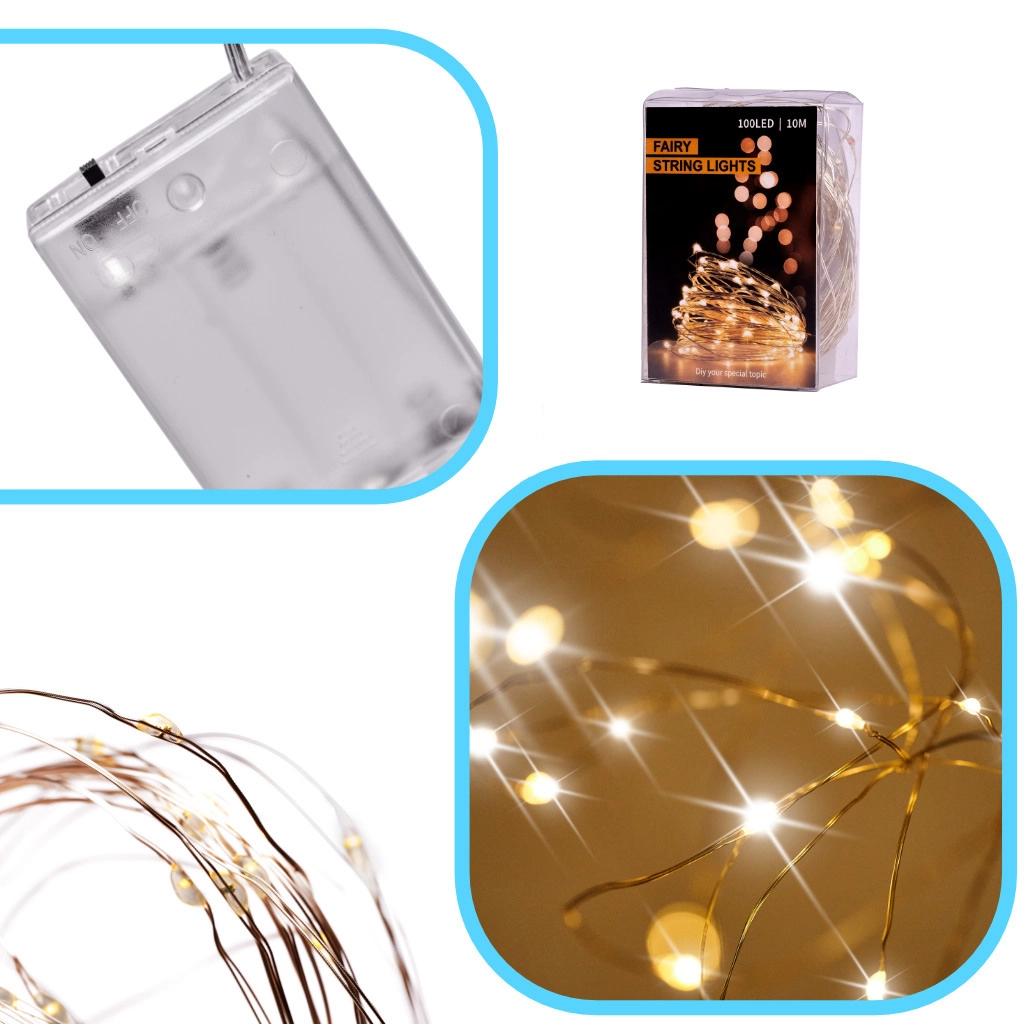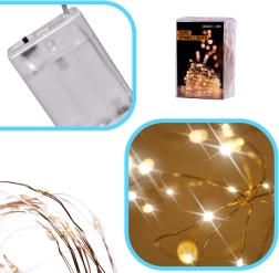 Švelni, šiltai balta šviesa jaukiai atmosferai namuose ir per Kalėdas. 10 metrų lankstaus vielinio laido su 100 LED, maitinamų baterijomis, lengvai paslėpsite šakose, stiklainiuose ar dekoracijose ir sukursite romantišką, jaukų apšvietimą bet kur be elektros lizdo.