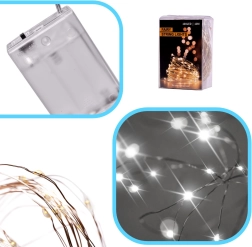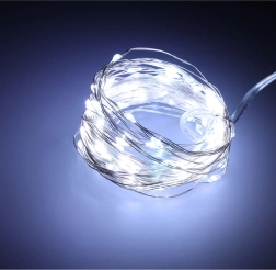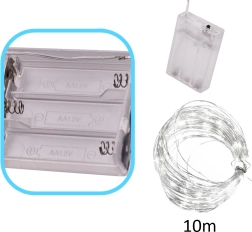 Subtili LED girlianda ant plonos vielutės, 10 m ilgio su 100 LED, šaltai baltos spalvos, sukurs šventinę atmosferą namuose ir ištisus metus. Dėl maitinimo baterijomis ją galite pastatyti bet kur, vielutę lengvai paslėpsite tarp spyglių, stiklainiuose ar dekoracijose ir sukursite romantišką apšvietimą be rūpesčių dėl elektros lizdo.