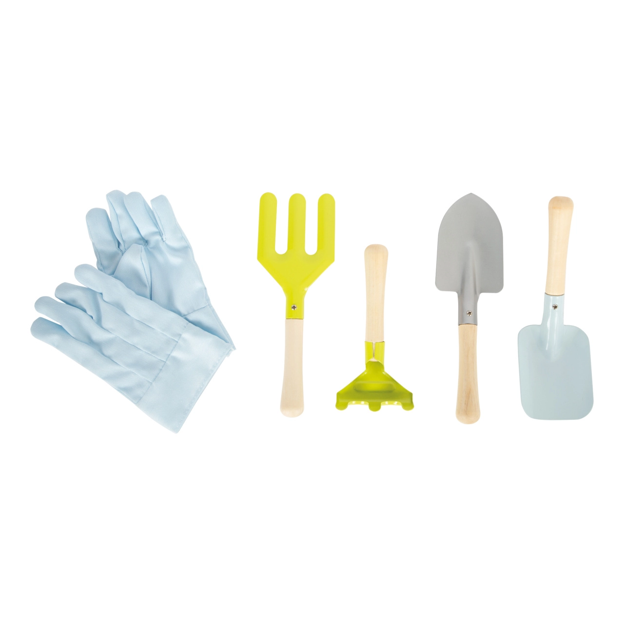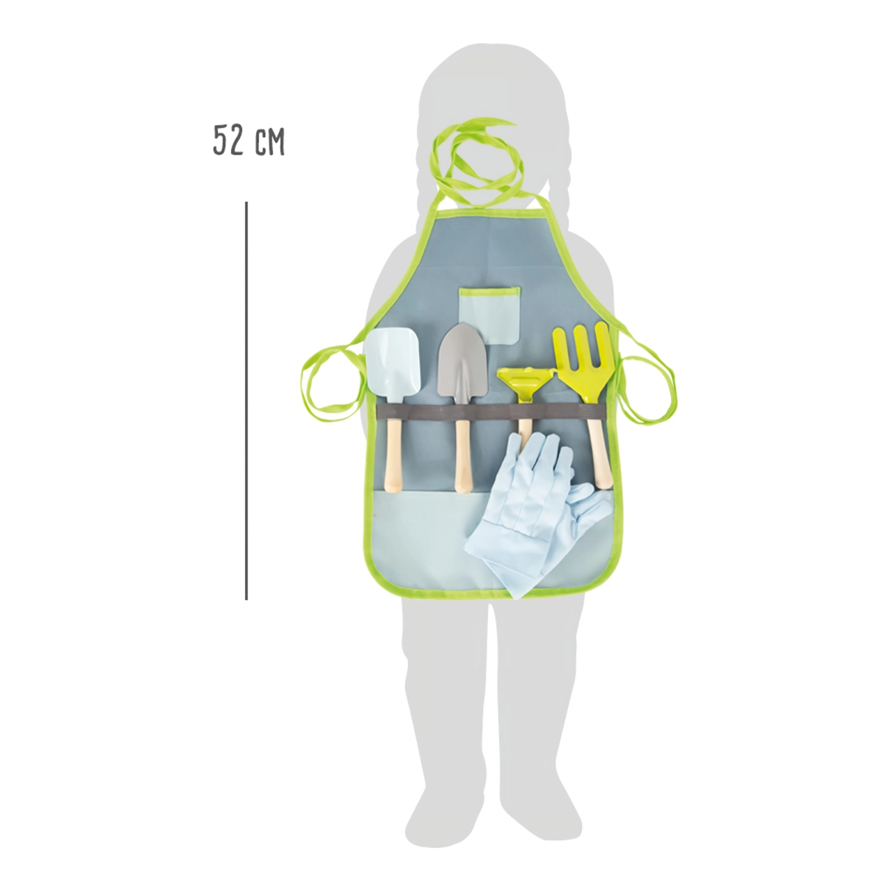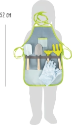 - Pilnas rinkinys: prijuostė, pirštinės ir 4 įrankiai (kastuvėlis, grėbliukas, semtuvėlis, šakutė)