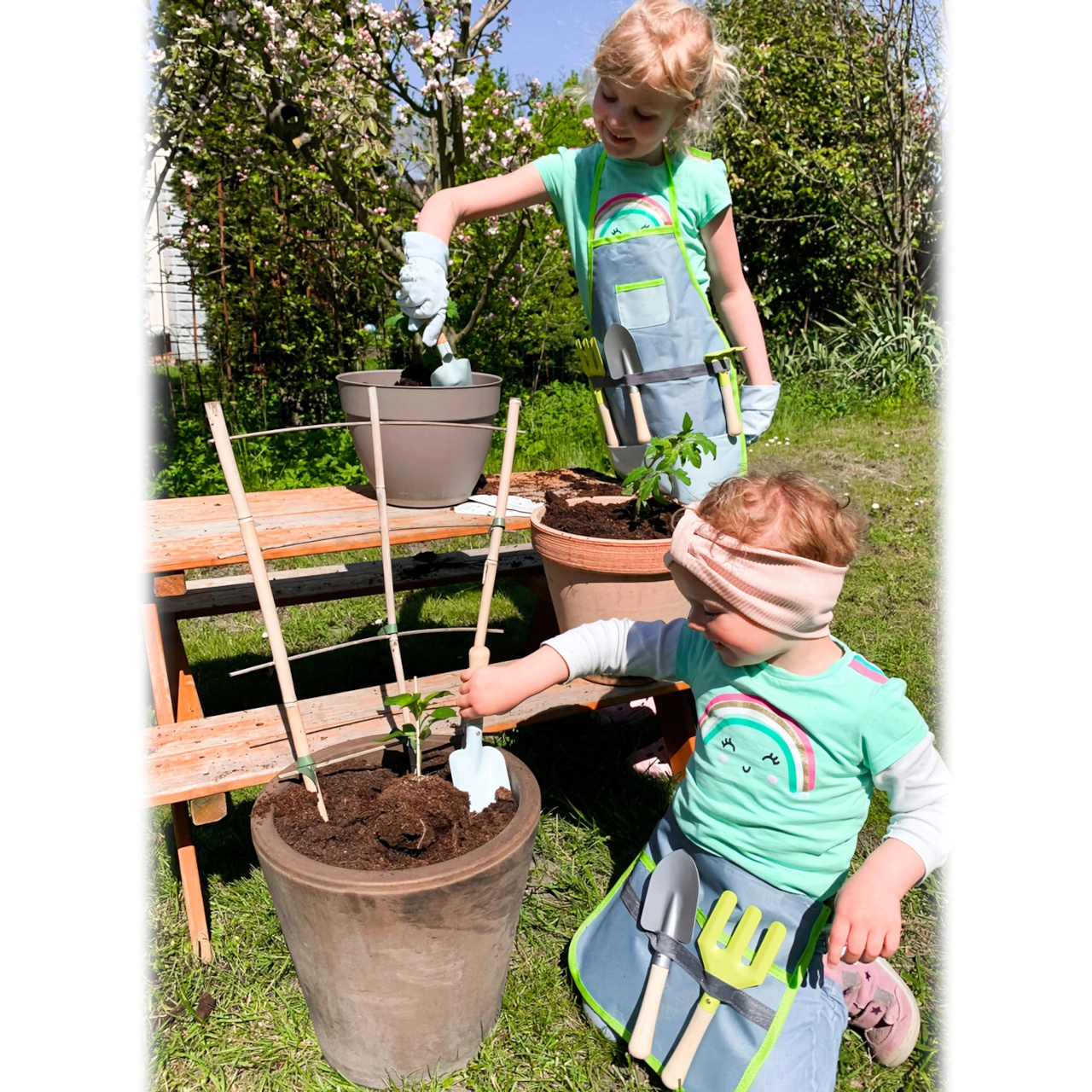 - Prijuostė, pirštinės, 4 vnt. įrankių (kastuvėlis, grėbliukas, semtuvėlis, šakutė)