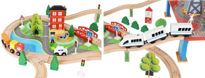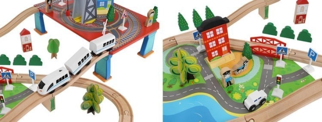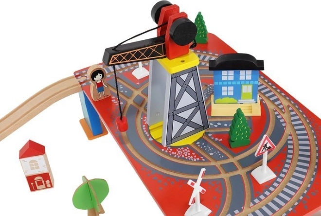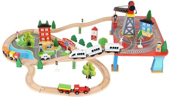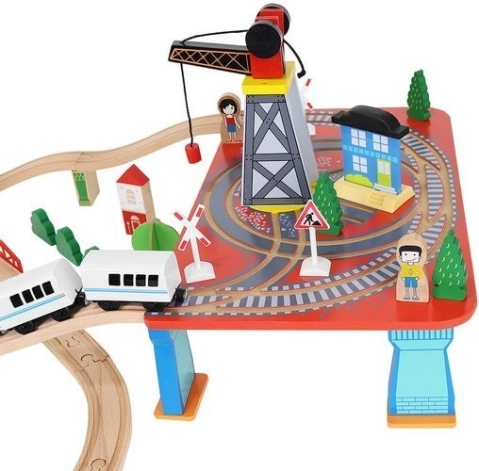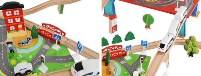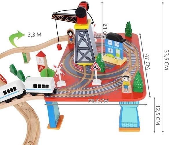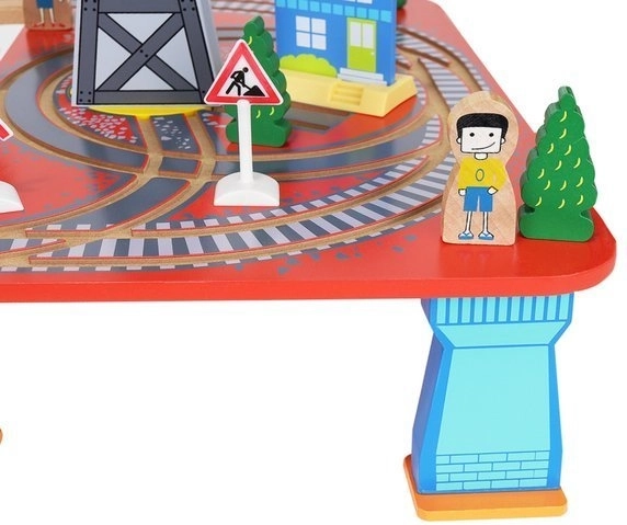 Medinė traukinių trasa su iš viso 88 preciziškai pagamintais elementais, įskaitant geležinkelį, krovininį ir keleivinį traukinį, automobilį, medelius ir kelio ženklus. Pramoga slypi galimybėje susikurti savo maršrutą, o magnetiniai jungimai užtikrina lengvą naudojimą.