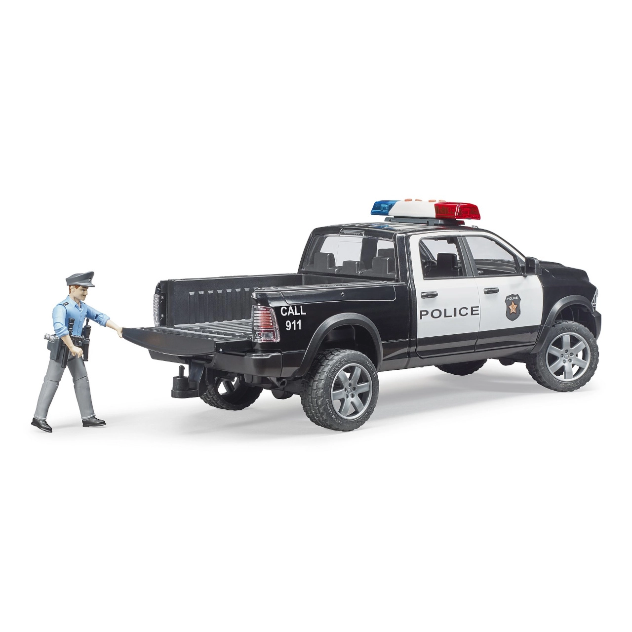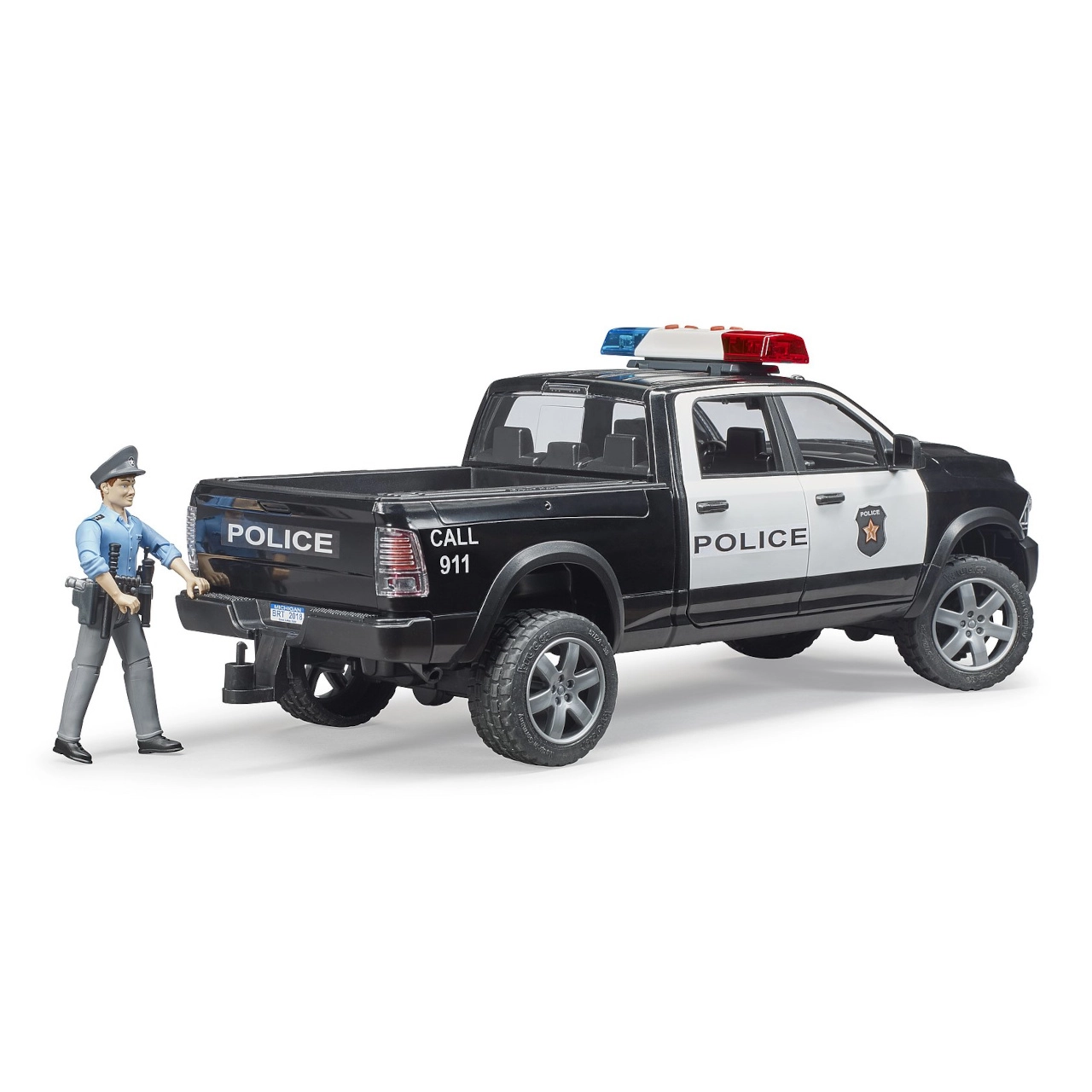 Automobilyje įrengtas švyturėlis su šviesos ir garso efektais, atsidarančios durys ir nuleidžiamas galinis bortas patogiam pakrovimui. Priekinės ašies vairavimas pailgintu vairu užtikrina tikslų manevravimą. Policininko figūrėlė su judančiomis galūnėmis ir įranga (antrankiai, lazda, pistoletas, racija) skatina kūrybišką ir realistišką žaidimą.