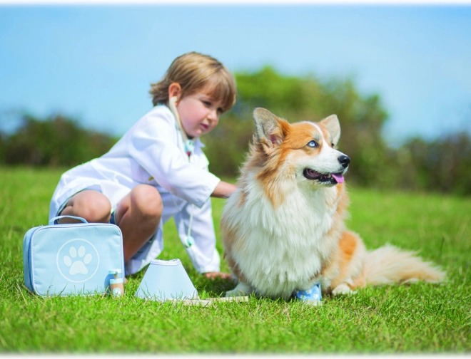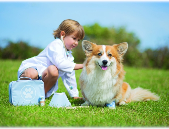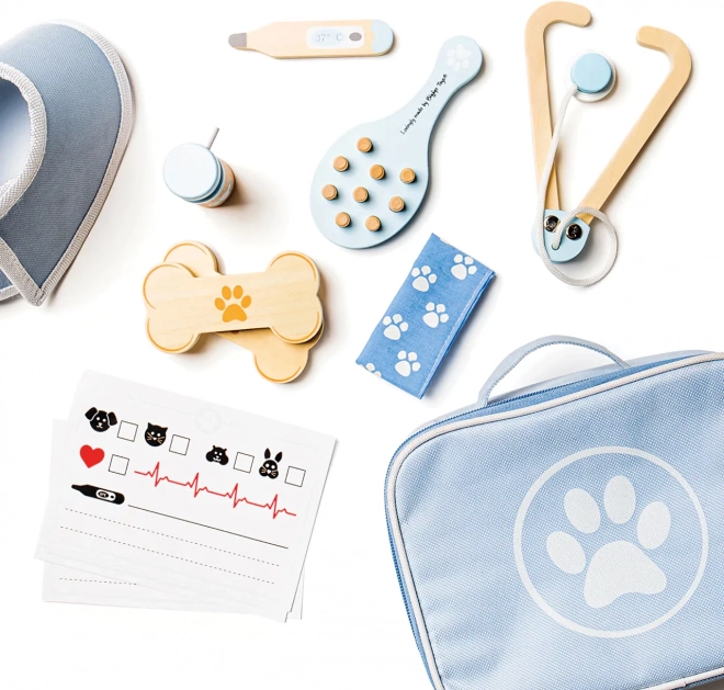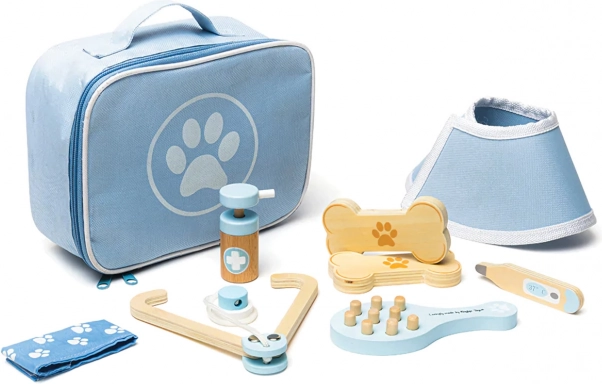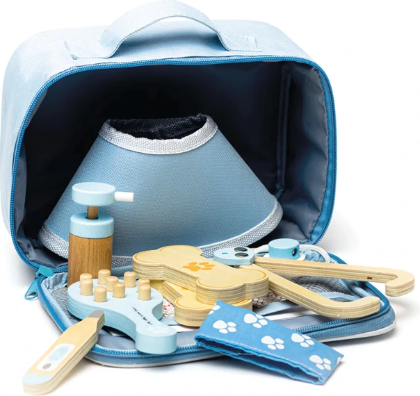 Visapusiškas veterinarinis lagaminėlis leidžia vaikams rūpintis pliušiniais žaislais ir gyvūnėlių figūrėlėmis kaip tikram gydytojui. Rinkinyje yra tokie įrankiai kaip stetoskopas, termometras, otoskopas, švirkštas, tvarstis, šepetys, apsauginis antkaklis ir kiti priedai. Viskas sudėta į patvarų tekstilinį krepšį su letenėlės simboliu – idealu nešiotis ir laikyti.