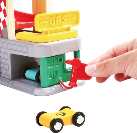 Trys garažai su atidaromomis durelėmis ir degalų papildymo stotelė skatina kūrybingus scenarijus – nuo techninės pertraukos iki parkavimo ir automobilių rūšiavimo.