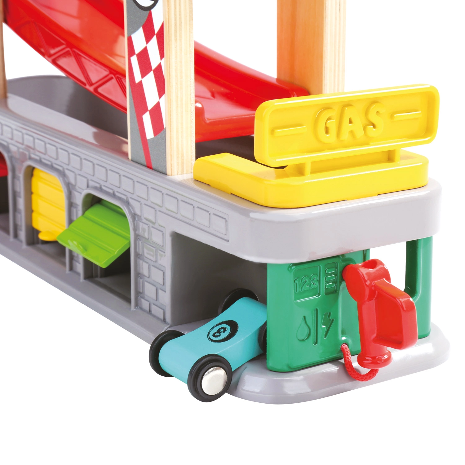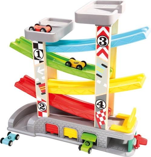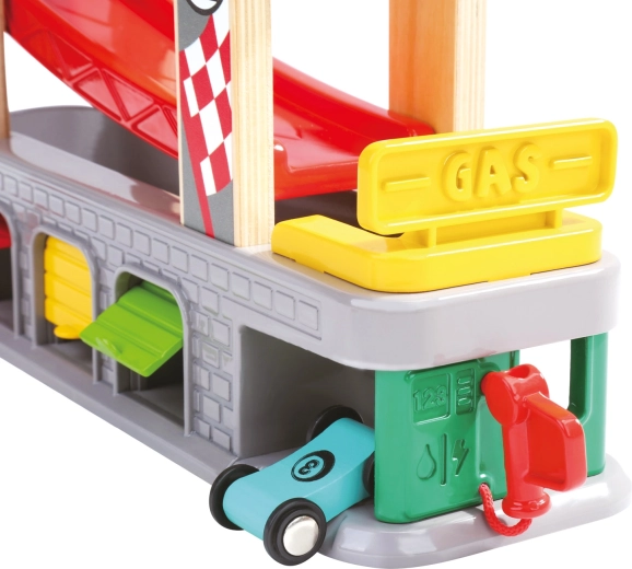 Stabili konstrukcija iš patvarių medžiagų atlaiko kasdienį žaidimą, o praktiški garažai tinka ir automobiliukų laikymui bei nešiojimui. Ryškios spalvos ir sunumeruoti aukštai padeda pažinti spalvas ir atlikti pagrindinius skaičiavimus. Rinkinyje yra keturi lengvai riedantys automobiliukai, kad lenktynės prasidėtų iš karto.