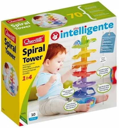 Quercetti Spiral Tower – puikus žaislas motoriniams įgūdžiams lavinti ir smagiai veiklai. 1–4 metų vaikai gali statyti aukštus spiralinius bokštus iš spalvotų dalių ir stebėti, kaip rutuliukai su barškantais karoliukais rieda žemyn. Šis žaislas patraukia jų dėmesį ir skatina akių bei rankų koordinaciją.