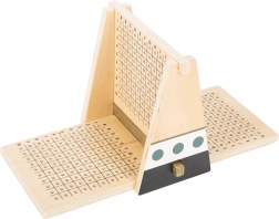 Ieškokite varžovo laivų ir ginkite savo flotilę šiuolaikiškame mediniame Laivų žaidimo variante. Centrinė pertvara užtikrina išdėstymo privatumą ir aiškų pataikymų bei nepataikymų žymėjimą – mėlynos vėliavėlės laivų aplinkai, baltos – tiesioginiams pataikymams. Dėl rėme esančių magnetų visa konstrukcija yra tvirta ir stabili, todėl viskas išlieka savo vietose net įtemptų dvikovų metu.
