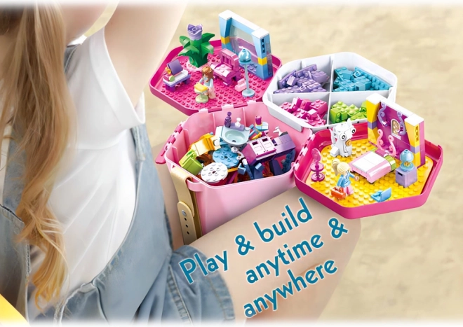 Sluban rinkinys rožiniame kibire suteikia valandas pramogų ir fantazijos lavinimo. Nešiojamas įpakavimas su dangčiu – konstravimo pagrindu – leidžia statyti bet kada ir bet kur. Dėl žemo sudėtingumo lygio idealiai tinka vaikams nuo 4 metų, o suderinamumas su LEGO, COBI ir MEGA BLOKS leidžia lengvai praplėsti jūsų kolekciją.