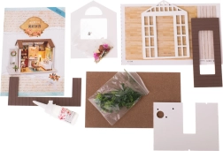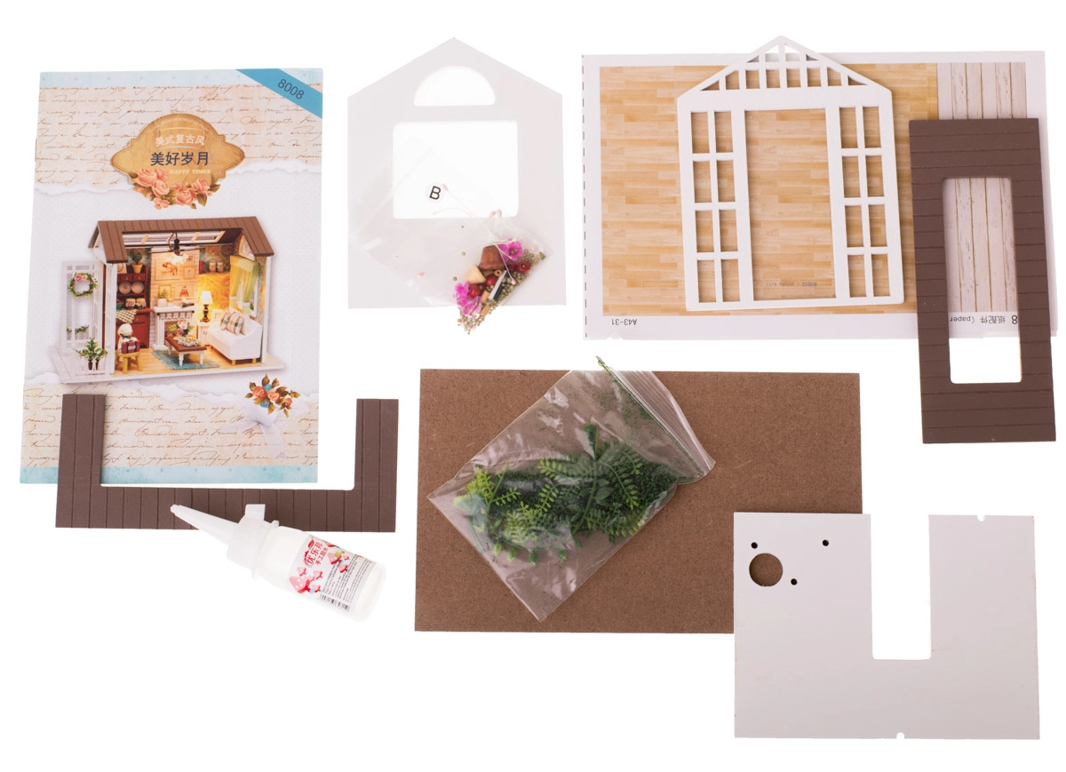 Rinkinyje yra viskas, ko reikia svetainės statybai ir jos įrangai, įskaitant klijus ir išsamią iliustruotą instrukciją. LED apšvietimas, esantis pakuotėje, veikia su baterijomis (2x AAA 1,5 V ir 3x 1,5 V LR54 – baterijos nepridedamos), kurios nuostabiai papildo bendrą atmosferą.