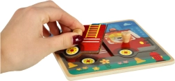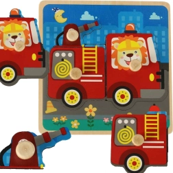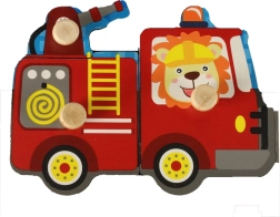 Medinė dėlionė su gaisrinės automobilio motyvu idealiai tinka mažiems vaikams, norintiems lavinti koordinaciją ir loginį mąstymą. Šis spalvingas ir smagus produktas skatina smulkiosios motorikos vystymąsi.