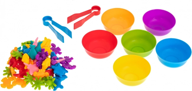 Šeši spalvoti dubenėliai ir 36 figūrėlės leidžia vaikams rūšiuoti, lyginti ir skaičiuoti – puikus pagrindas matematikos įgūdžiams.