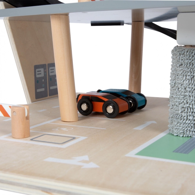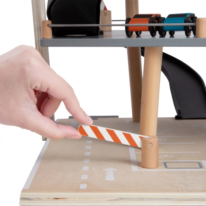 Šis stilingas medinis lenktynių parkingas vaikams suteikia turtingą žaidimų pasaulį. Trys aukštai sujungti funkciniu liftu ir dviem sklandiomis rampomis, leidžiančiomis mašinėlėms judėti be trukdžių. Kiekviename aukšte įrengtos mechaninės užtvaros ir guminės atitvaros, kurios suteikia dinamikos ir apsaugo nuo transporto priemonių iškritimo. Spalvotos piktogramos ir kelio ženklai skatina mokymąsi žaidžiant ir lavina vaizduotę.