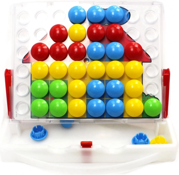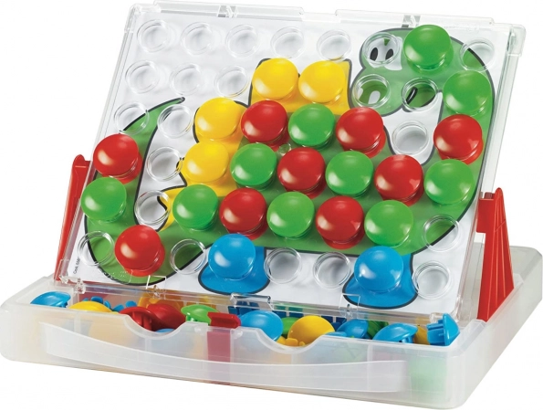 Mozaika praktiškame lagaminėlyje leidžia vaikams dėlioti linksmus paveikslėlius pagal pridėtas šablonų korteles arba pagal savo fantaziją. Lentą galima įstatyti į atramas ir naudoti vertikalioje padėtyje dar patogesniam žaidimui. Didelės, spalvingos „kepurėlės“ yra saugios ir lengvai sugriebiamos net mažoms vaikų rankoms.