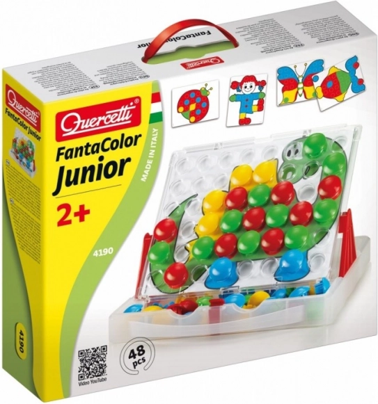 Atraskite kūrybinę mozaiką QUERCETTI FANTACOLOR JUNIOR, kuri lavina vaikų fantaziją ir smulkiąją motoriką. Dėl didelių „kepurėlių“ vaikams lengva jas suimti, praktiškas lagaminėlis viską laiko tvarkingai, o 8 dvišalės kortelės įkvepia kūrybai. Žaislas skatina spalvų atpažinimą, akies ir rankos koordinaciją, sutelktą dėmesį ir kantrybę.