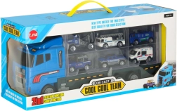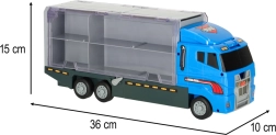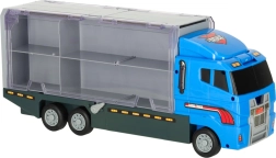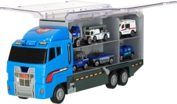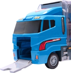 Mėlynas sunkvežimis ne tik gali pervežti net 14 transporto priemonių, bet ir dėl realistinių detalių tampa neatsispiriamu žaislu vaikams. Permatomos durelės ir paleidimo įrenginys suteikia dar daugiau azarto.