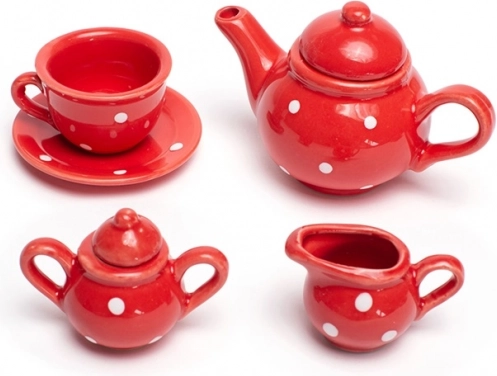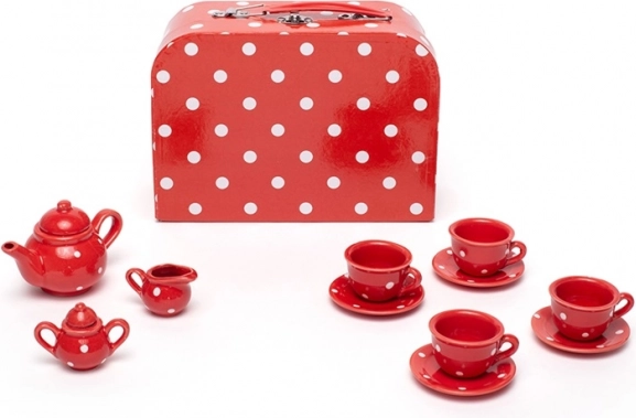 Surenkite tobulą vaikų arbatos popietę su šiuo žaviu raudonu rinkiniu su baltais taškeliais. Komplekte yra viskas, ko mažiesiems šeimininkams reikia – arbatinukas, 4 puodeliai su lėkštutėmis, cukrinė ir pieninukė. Po žaidimo viską lengva sudėti į tvirtą lagaminėlį, todėl rinkinys puikiai tinka ir kelionėms. Pagaminta iš kokybiškų medžiagų ir atitinka Europos saugos standartus.