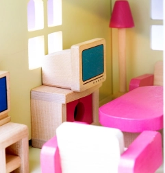 Šis medinių baldų rinkinys lėlių nameliams yra idealus sprendimas kiekvienam mažajam interjero dizaineriui. Rinkinyje yra viskas, ko reikia įrengti virtuvę, svetainę, miegamąjį, vonios kambarį ir net palėpę.