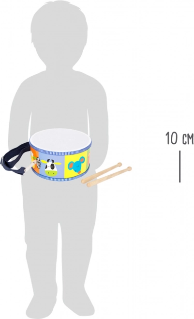 Spalvingas vaikiškas būgnas su gyvūnų motyvais iš Small Foot prekės ženklo – puikus pasirinkimas vaikų ritmo ir koordinacijos ugdymui. Komplekte yra dvi medinės lazdelės ir reguliuojamas dirželis patogiam nešiojimui.