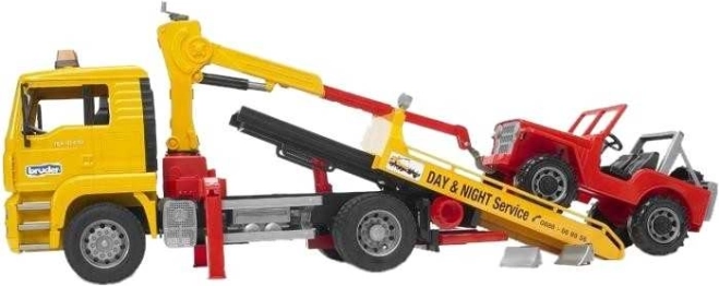 Bruder MAN vilkimo sunkvežimis – idealus žaislas vaikams, mėgstantiems simuliacijas ir žaisti su realistiškais automobilių modeliais. Sunkvežimis turi pakeliamą kabiną, leidžiančią pažvelgti į variklio skyrių, ir yra su priekiniu stiklu iš tvirto polikarbonato. Už kabinos įrengta pasukama manipuliavimo strėlė su grandinėmis patogiam Jeep valdymui.