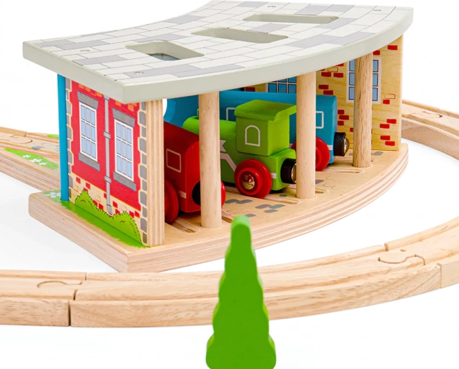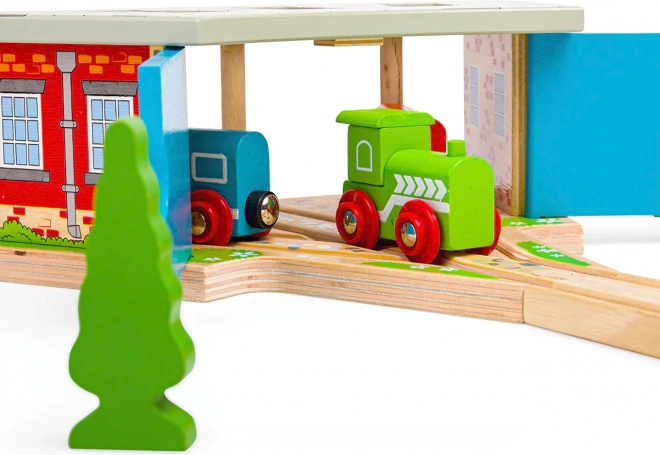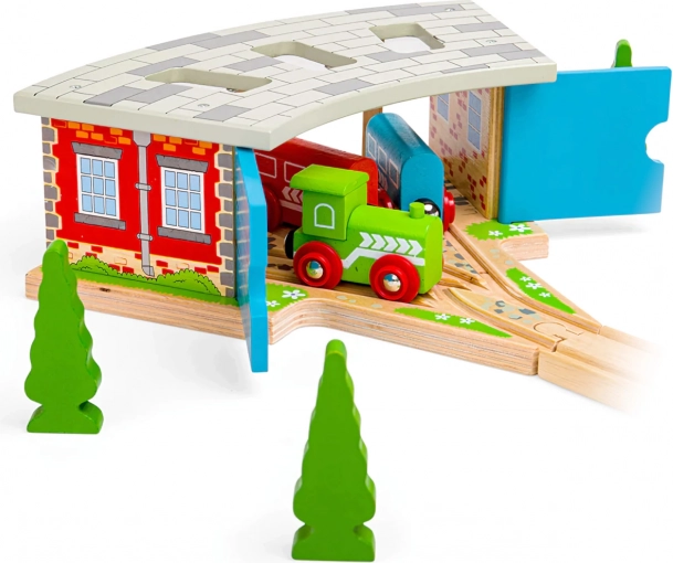 Bigjigs Rail trigubas depas su vartais medinėms traukinių trasoms