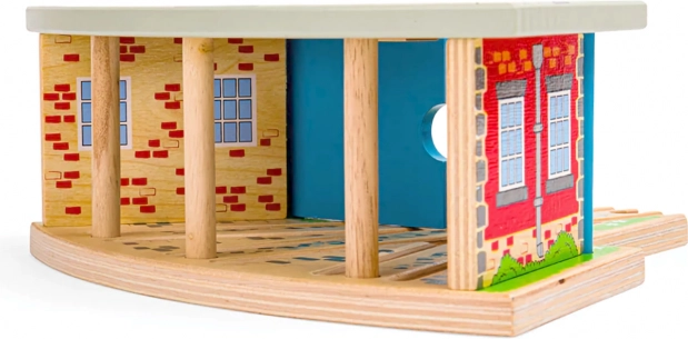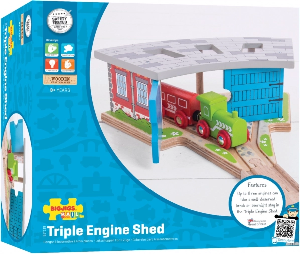 Trigubas depas su vartais – idealus priedas kiekvienam mažajam mašinistui. Dėl trijų stovėjimo vietų ir integruoto bėgių prijungimo lengvai suorganizuosite eismą trasoje ir saugiai pastatysite traukinukus po dienos, pilnos važiavimo. Tvirta medinė konstrukcija su spalvingomis detalėmis atrodo realistiškai ir atlaiko intensyvų žaidimą.
