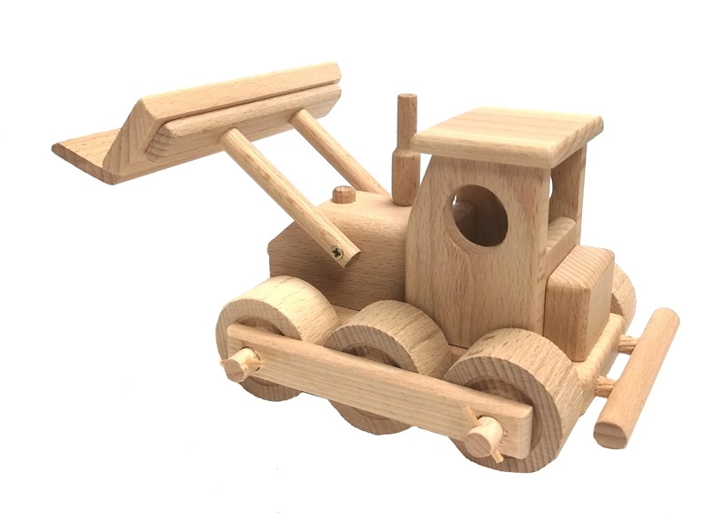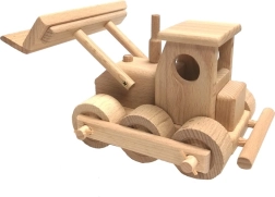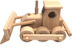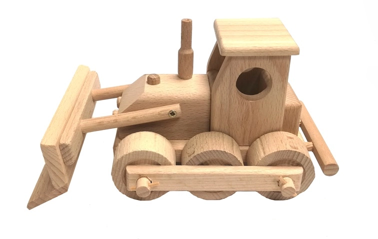 Klasikinis medinis buldozeris iš kokybiškos buko medienos mažiesiems statytojams. Turi judančią mentę, besisukančius ratelius ir apvalintus kraštus saugiam žaidimui. Paviršius tik vaškuotas ir poliruotas, be cheminių dangų, todėl išlaiko natūralią išvaizdą. Puikiai tinka vaizduotei lavinti namuose ir smėlio dėžėje.