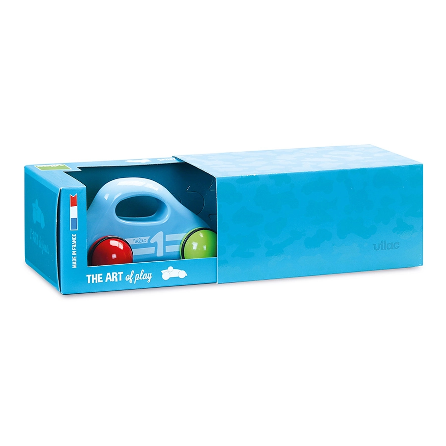 Stilingas medinis VILAC automobiliukas mėlynos spalvos pradžiugins mažus lenktynininkus ir dizaino mylėtojus. Pagamintas iš lakuotos medienos, turi gumuotus spalvotus ratus tyliai ir tolygiai eigai bei ergonomišką rankeną lengvam suėmimui. Puikiai lavina smulkiąją motoriką, saugus nuo 12 mėnesių ir dėl kokybiško apdirbimo taip pat yra elegantiška dekoracija. Pagaminta Prancūzijoje.