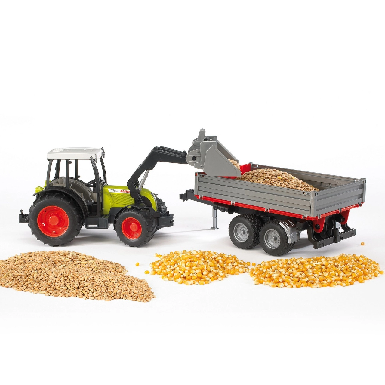 Priekinis krautuvas pilnai funkcionalus ir lengvai nuimamas, kabina įstiklinta, o variklio dangtis atidaromas. Išskirtinumas – antras vairas su pailginta svirtimi, kuri įstatoma per stogą į kabiną ir gerokai palengvina valdymą. Priekaba – tikro dviašio modelio kopija: turi atidaromas šonines ir galinę bortines sieneles bei sverčiamą platformą realistiniam pakrovimui ir iškrovimui.