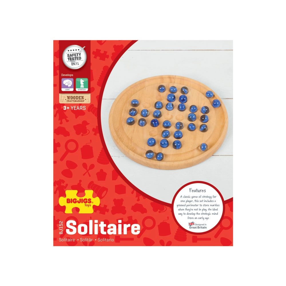 Atraskite nesenstančią pramogą su BIGJIGS TOYS mediniu solitaire. Blizgantys mėlyni rutuliukai ir kruopščiai apdirbta apvali lenta kuria elegantišką loginį žaidimą, kuris patikrins jūsų sumanumą ir kantrybę. Tikslas – šokinėjant po vieną rutuliuką palikti lentoje tik vieną.