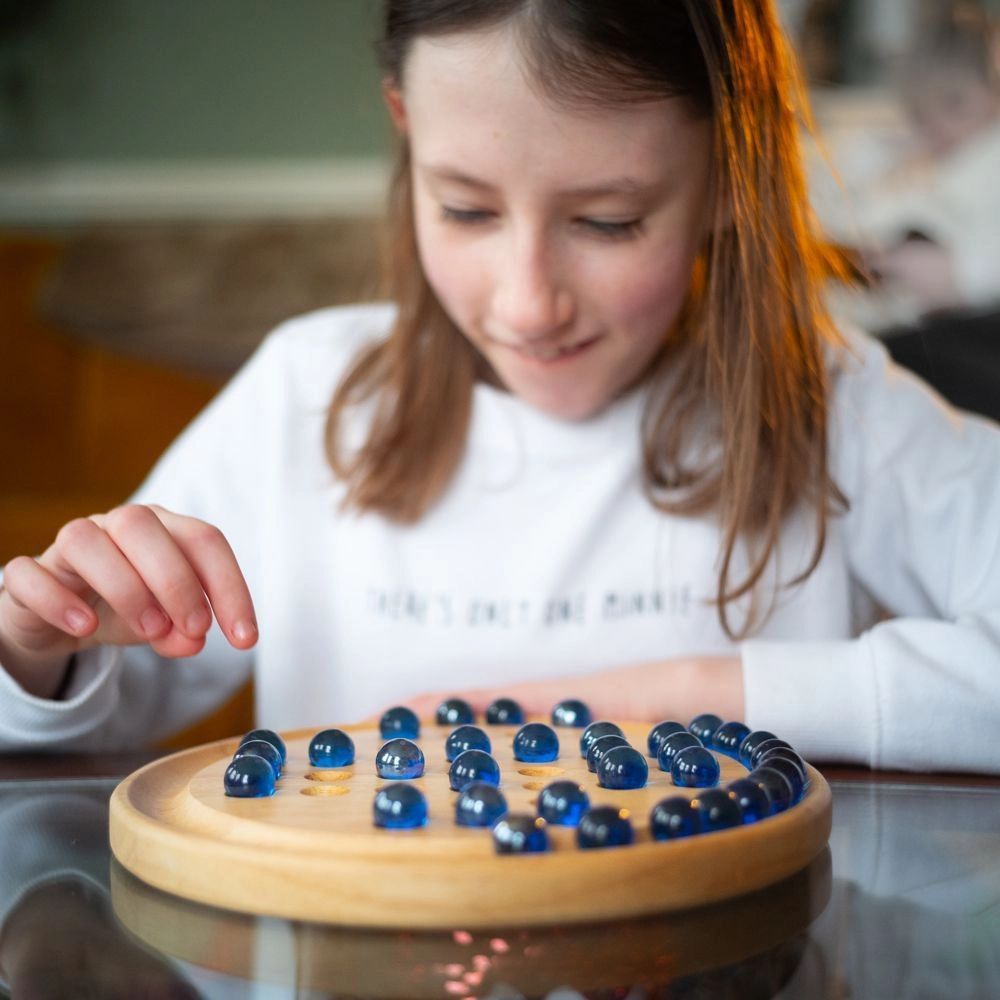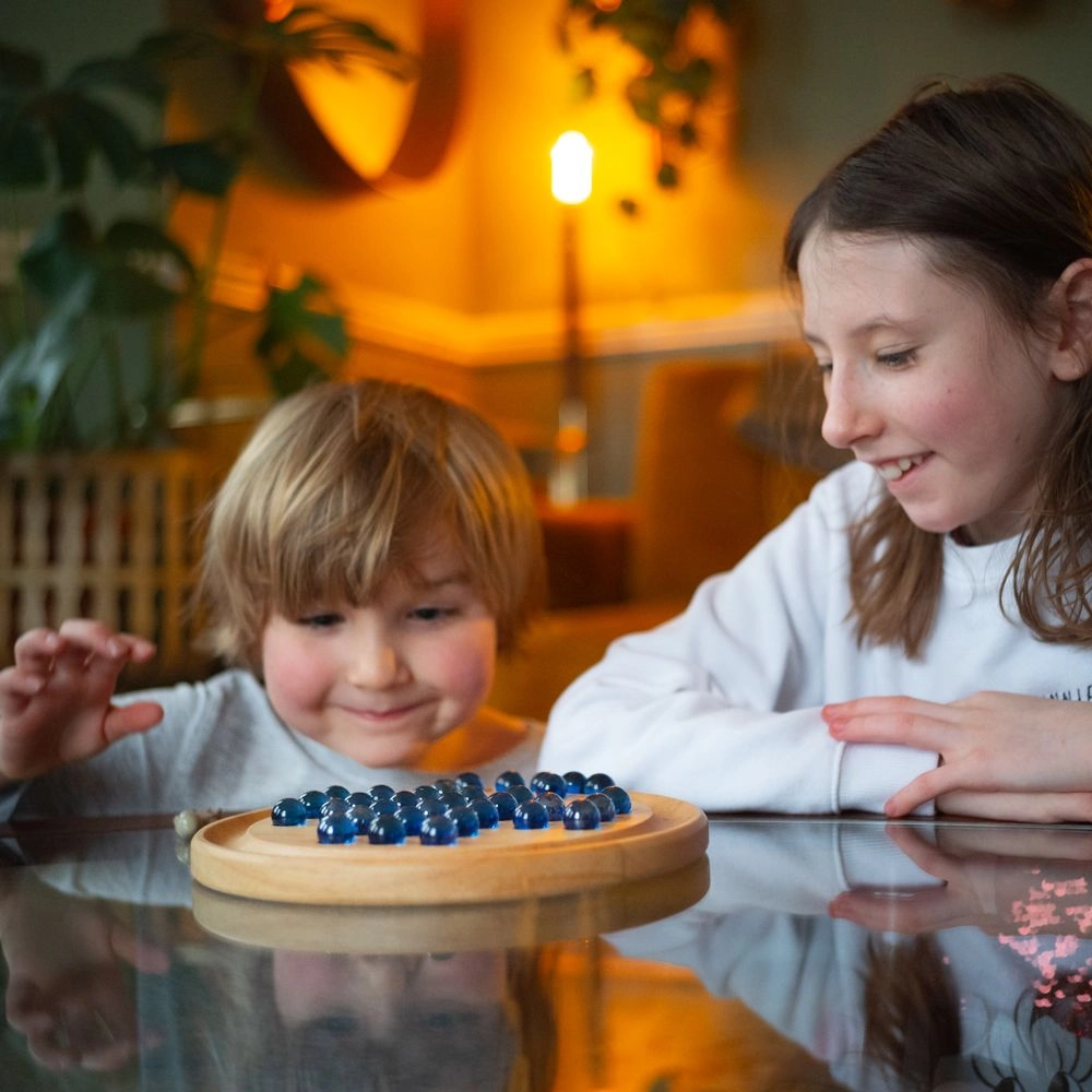Klasikinis medinis solitaire su 32 stikliniais rutuliukais ant apvalios lentos lavina logiką, strateginį mąstymą ir susikaupimą nuo ankstyvo amžiaus. Pagaminta iš aukštos kokybės tvarios medienos, atitinka Europos saugos standartus ir idealiai tinka ramiam vieno žaidėjo žaidimui.