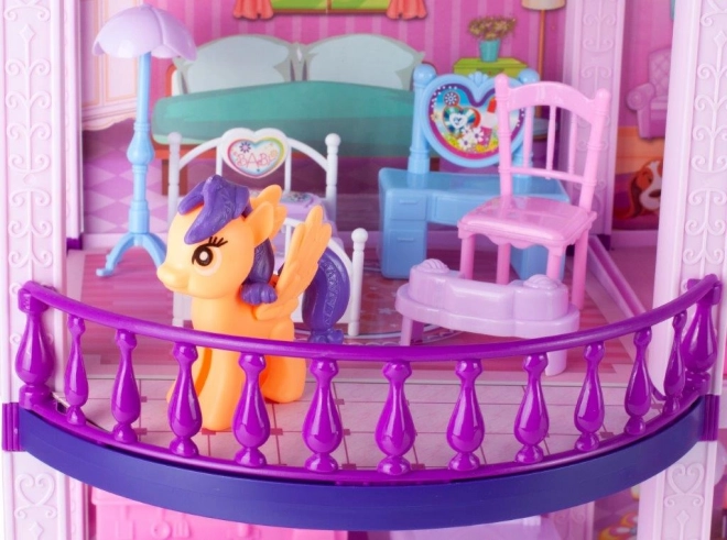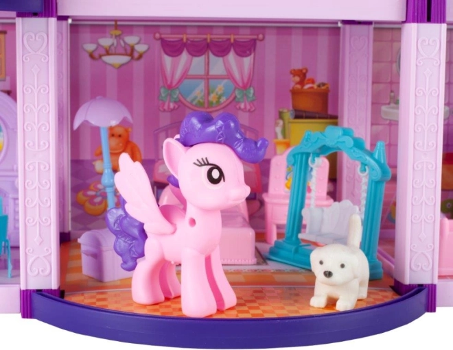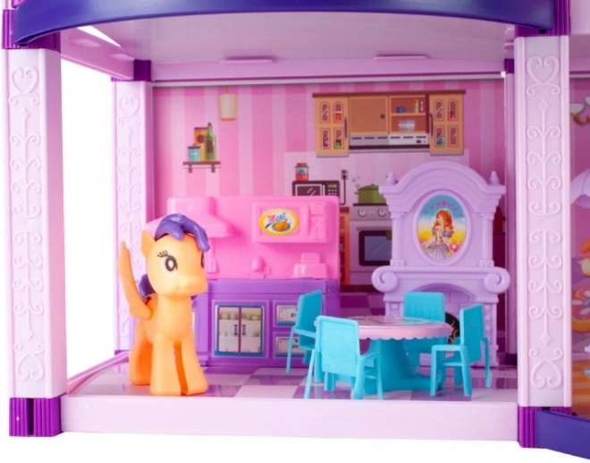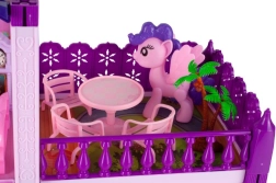 Spalvingas dviejų aukštų lėlių ir poniukų namelis siūlo daug pramogų ir aksesuarų kūrybiškiems žaidimams. Rinkinyje yra poniukų figūrėlės ir šuniukas, virtuvės, miegamojo ir vonios kambario baldai, taip pat balkonai ir terasa žaidimams lauke. Idealu vaikams nuo 3 metų, kurie mėgsta fantazijos istorijas, gausius priedus ir interaktyvų žaidimą.