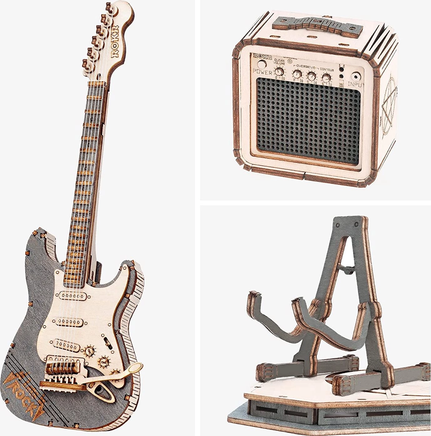 Ši medinė 3D elektrinės gitaros dėlionė pradžiugins visus muzikos ir elegantiškų dekoracijų mylėtojus. Modelis sukurtas eksponavimui – be judančių dalių, su švaria natūralia išvaizda ir preciziškai išraižytomis detalėmis, kurios išsiskiria bet kuriame interjere.