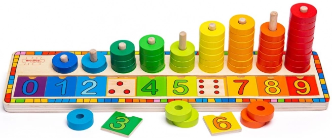 Skaitmenų eilutės 0–9 ir stumiami žiedai padeda vaikams natūraliai suprasti kiekius, eilės tvarką ir skaičiavimo pagrindus.