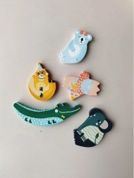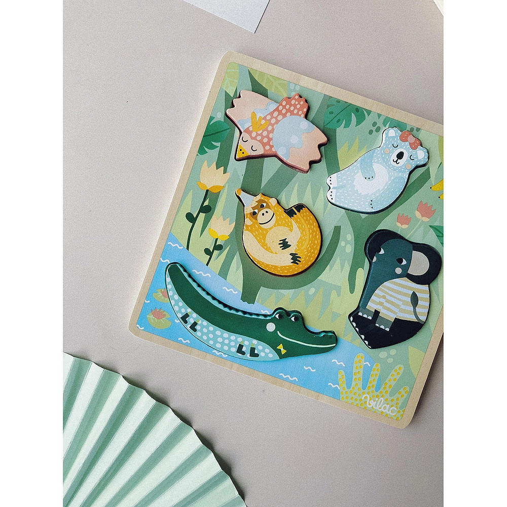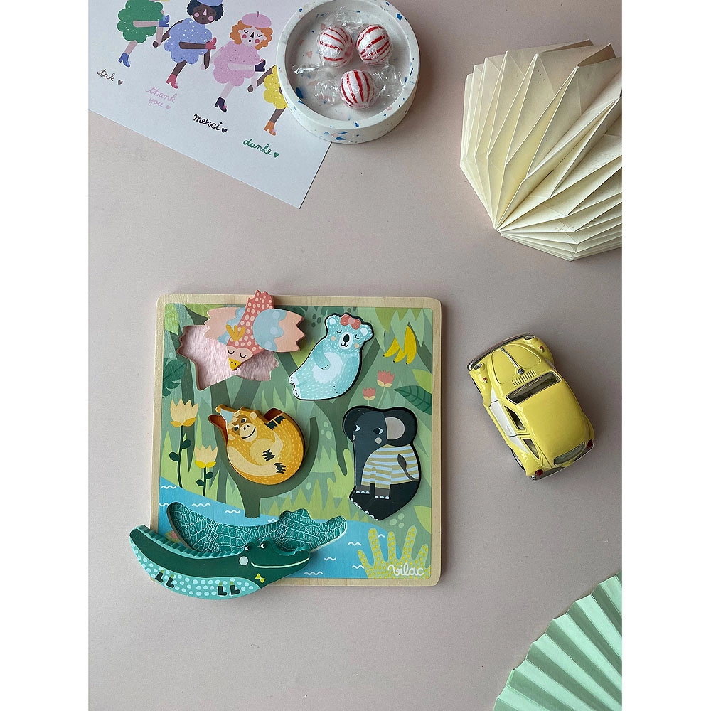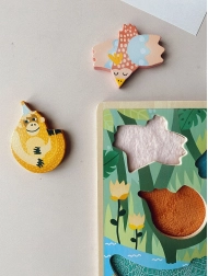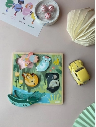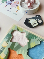 Michelle Carlslund dizainas švelniomis pastelinėmis spalvomis suteikia žaislui patrauklią išvaizdą ir skatina vaizduotę. Medinė bazė su išpjovomis ir gyvūnų motyvais moko vaikus derinti formas, atpažinti spalvas ir gyvūnus. Dėlionė patvari, saugi ir pagaminta iš kokybiškos medienos derinant su tekstile.
